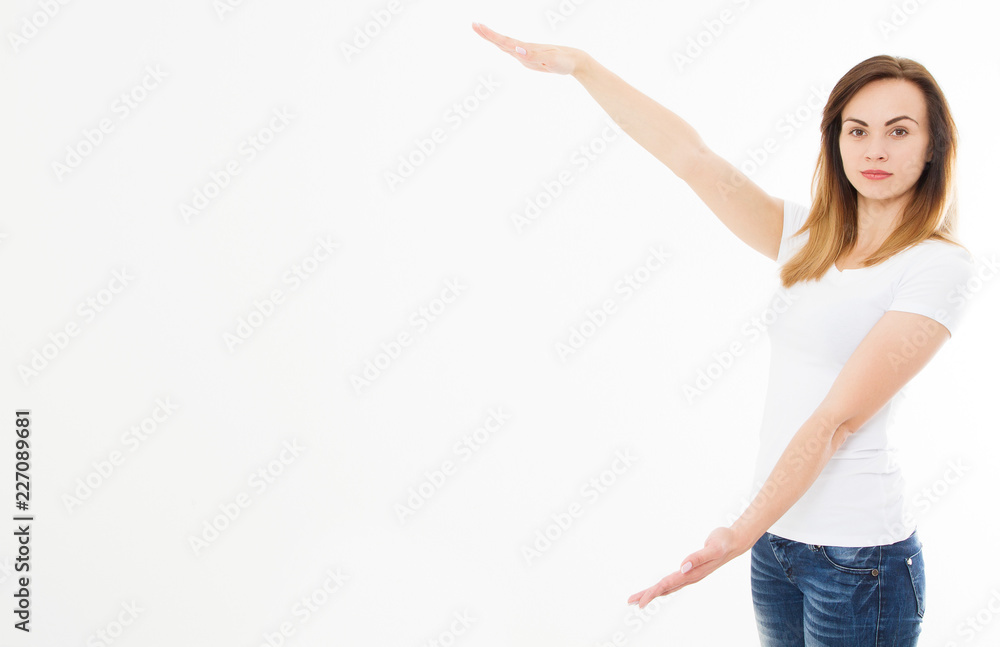 Caucasian girl in tshirt isolated on white background showing copy space by hands. European young woman. Mock up.