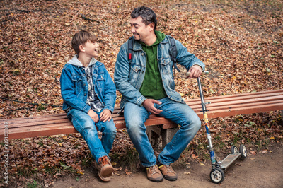 Happy dad and son talking in the autumn park on a bench. Family holiday