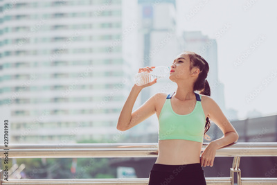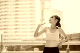 Beautiful fitness athlete woman drinking water after work out exercising on sunset evening summer in city outdoor portrait.Young woman drinking water after jogging