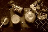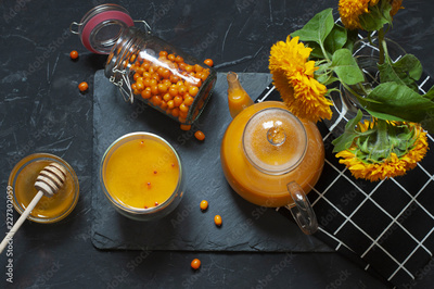 Sea buckthorn tea flat lay. Top view hot autumn beverage in a glass