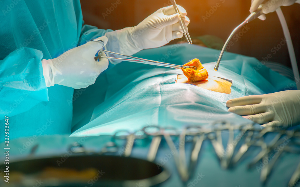 Close-up of gloved hands holding surgical tool.Surgery team operating in a surgical room.