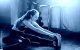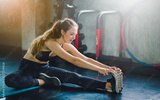 Woman at the gym doing stretching exercises and smiling on the floor.Sport background.