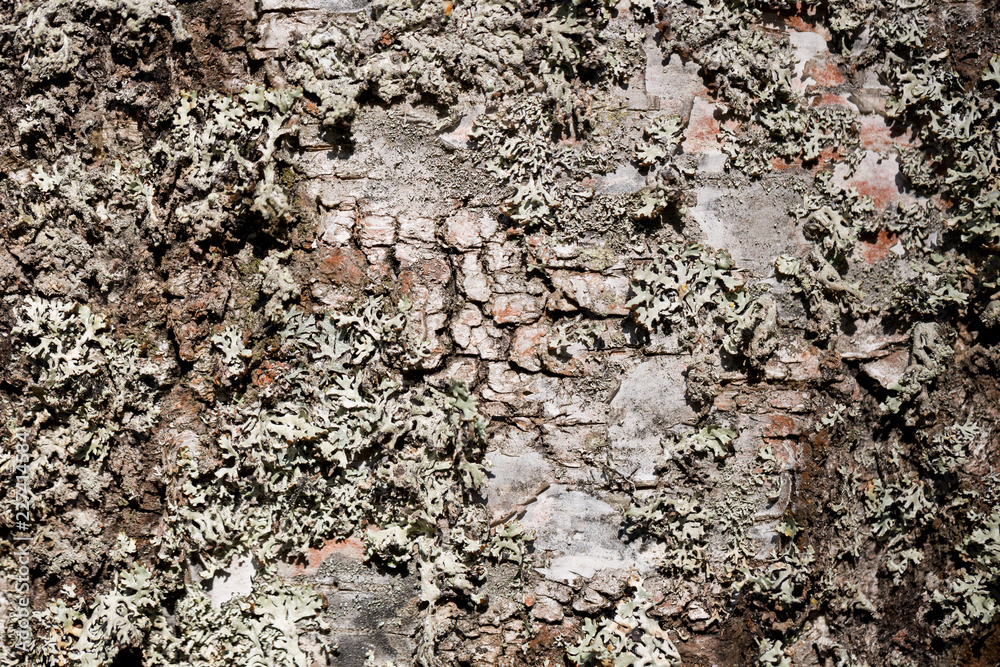 Old wood tree bark cortex texture with moss. Old birch tree. Selective focus.