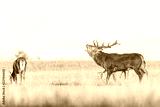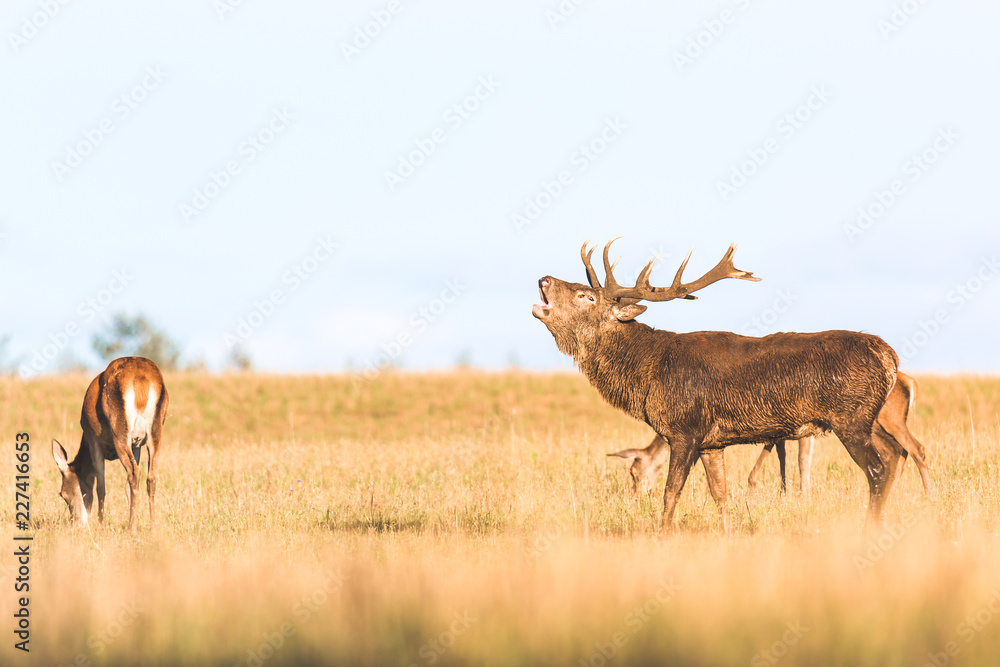 Red deer group with belling deer stag in autumn. Autumn landscape with herd of deer. Cervus Elaphus. Natural habitat.