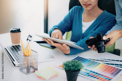 Photo artist and graphic desginer are working.
