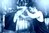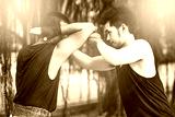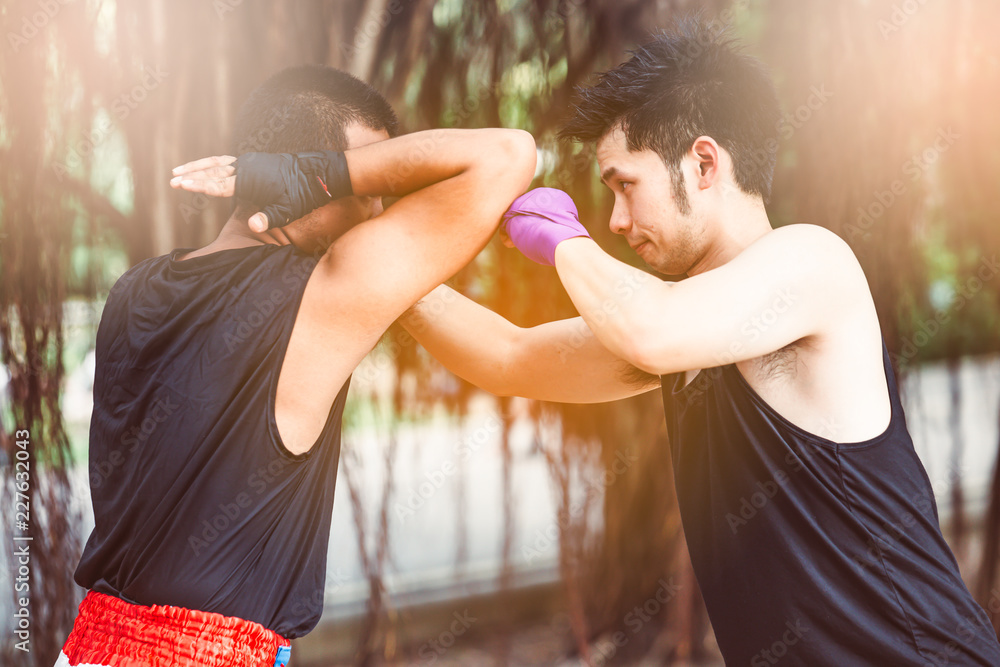 Muay thai martial art or Thai boxing,Two young kickbox fighters training in the park