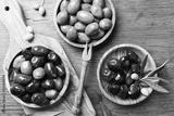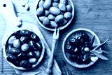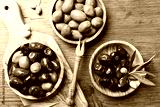 Natural greek olives in bowls with kitchen board from olive tree from above.