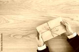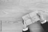 Businessman Gives a gift presents laid on a wooden table background. Copy space.