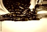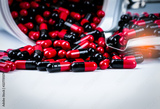 Red-black antibiotic capsule pills spill out of white plastic bottle container and drug tray. Pharmaceutical industry. Prescription drug. Global healthcare. Antimicrobial drug resistance. Pharmacy.