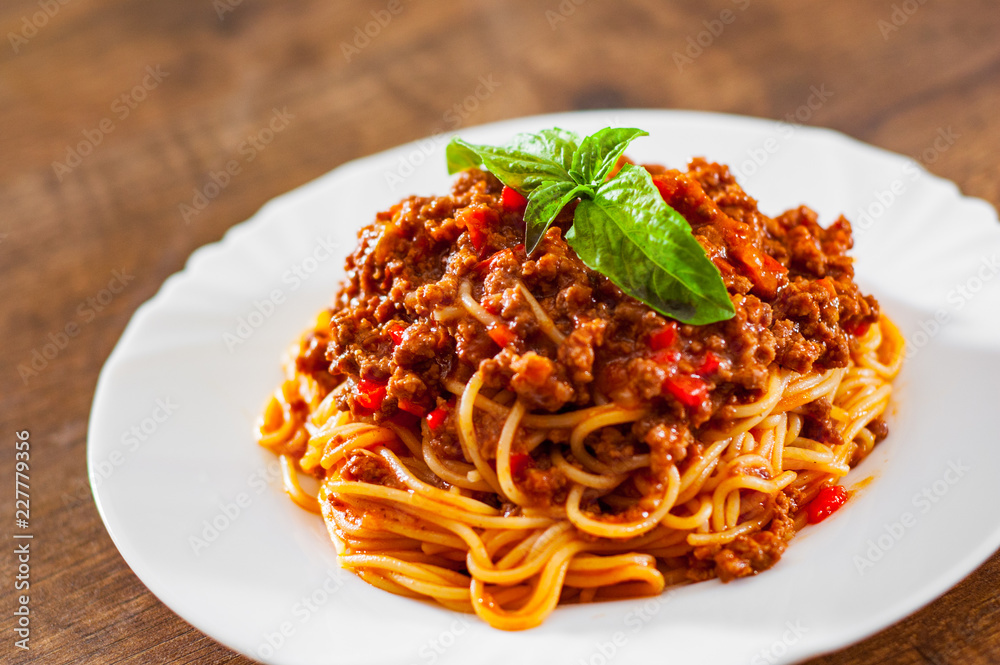 Traditional pasta spaghetti bolognese in white plate on wooden table background