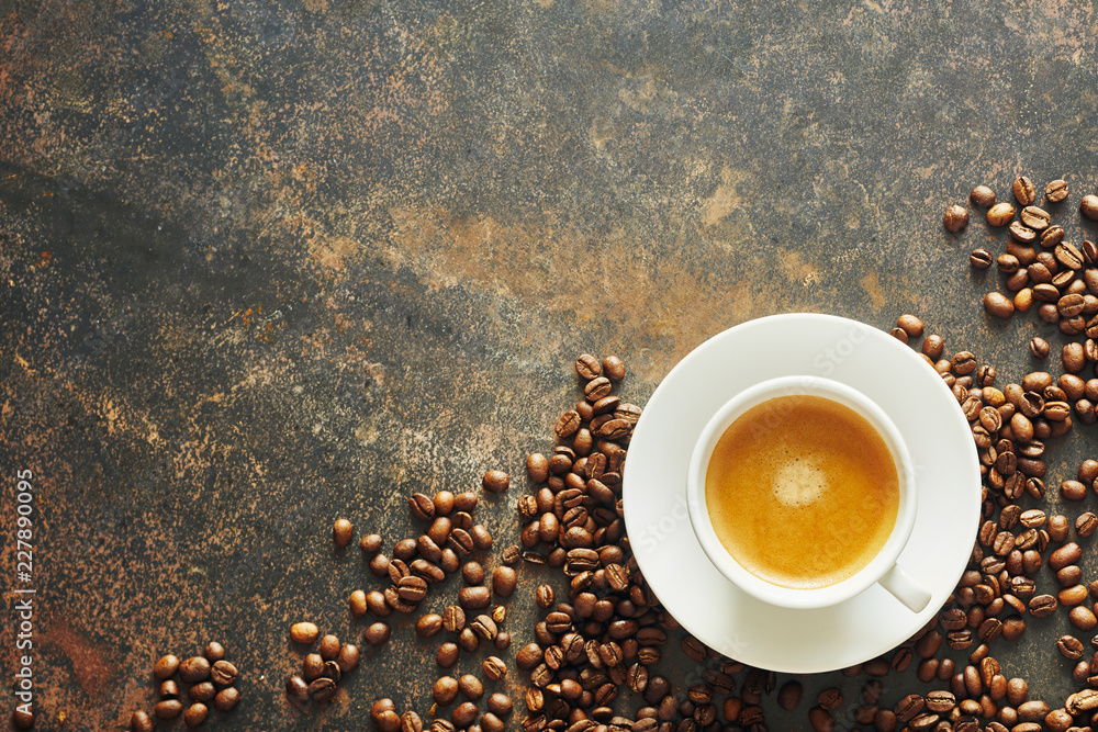 Cup of latte coffee with roasted beans