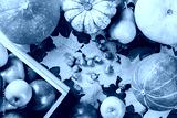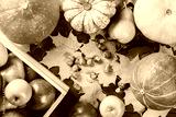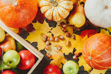 Ripe apples in a box with pumpkins, pears, hazelnuts and colorful maple leaves on dark wooden background. Autumn seasonal image. Top view