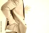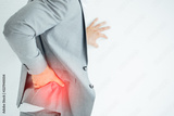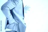Businessman suffering for backache.Isolated on white.Backache concept bending over in pain with hands holding lower back.