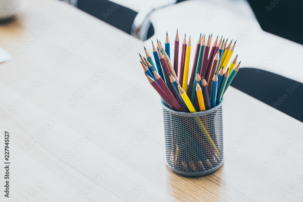 Pencils in a box placed on a table.colorful pencils on wood table background.