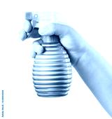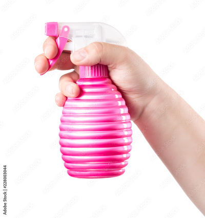 Pink water pulverizer spray in female hand cloe up isolated on white background.