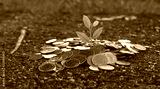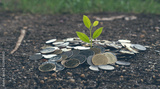 Money growing concept, Plant on pile coins on the ground. Vintage Tone