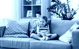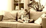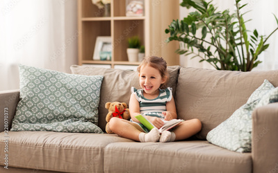childhood and people concept - happy little girl sitting on sofa with book and toy teddy bear at home