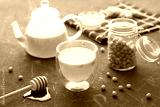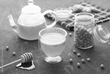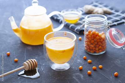 Sea buckthorn tea close up. Hot autumn beverage in a glass
