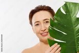 Beauty wrinkle middle age woman face portrait. Spa and anti aging concept Isolated on white background. Plastic surgery and collagen face injections. Wrinkles and menopause. Copy space