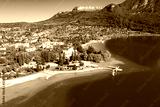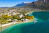 Aerial view of Annecy lake waterfront low tide level due to the drought in France