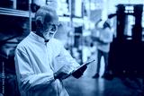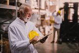 Picture of older male warehouse employee standing in storage and looking at his tablet. Dressed in white coat and yellow helmet.