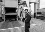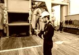 Marine Deck Officer or Chief mate on deck of vessel or ship . He is inspecting and writing checklist. Ship paperwork