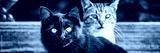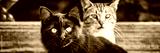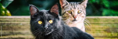 Black cat with yellow eyes banners . Two cute cats outside in garden looking. Panoramic crop. House pets animals.