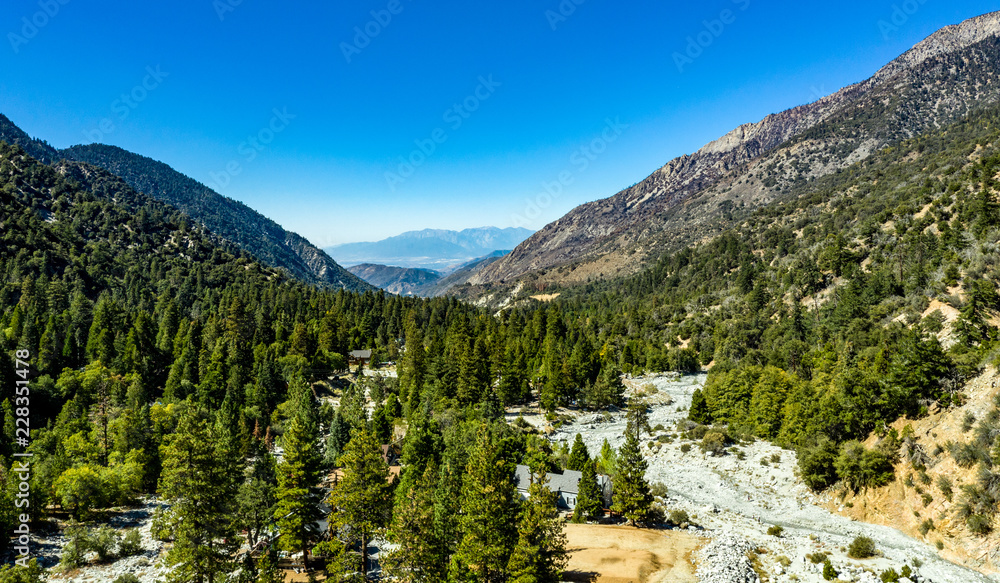 Aerial view of Forest Falls and Oak Creek in the San bernardino Mountains and National Forest with blue sky, green and yellow trees and plants