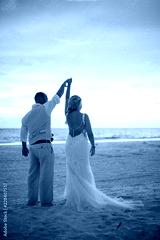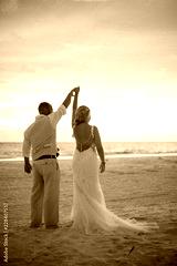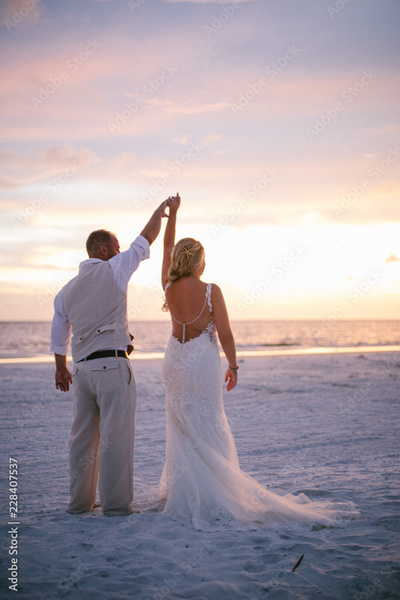 Brand New Husband and Wife Dancing and Kissing on the Beach After Wedding in Front of the Sunset