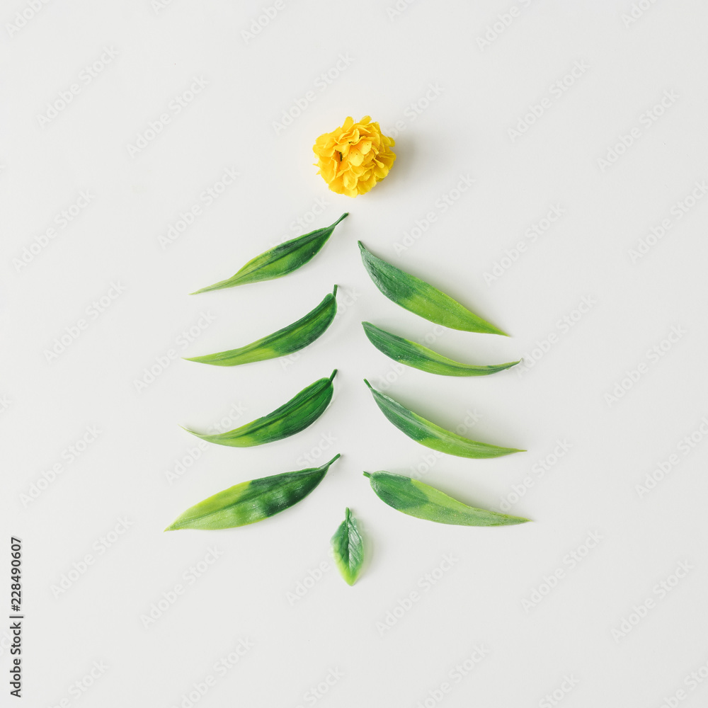 Christmas tree made of green leaves and flower. Minimal nature inspiration. Flat lay holiday concept.