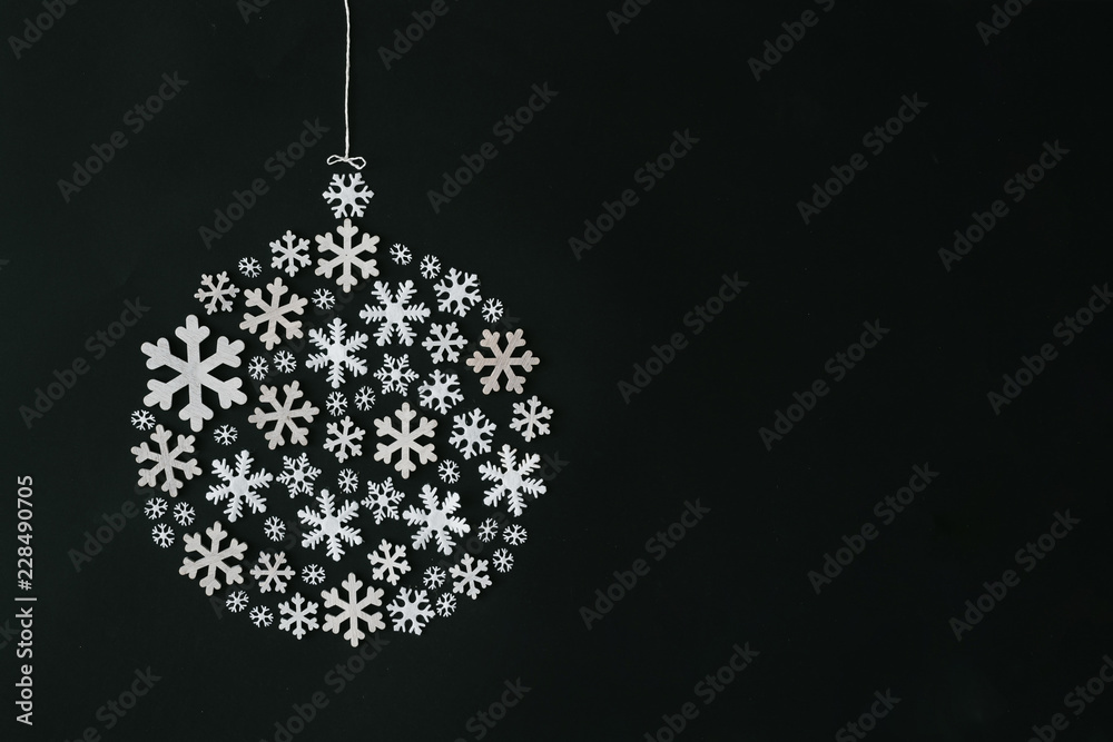 Christmas bauble or ball decoration made of white snowlakes. Winter holiday background.
