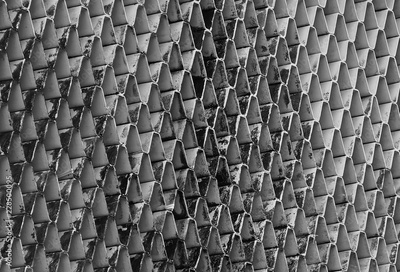 Closeup ventilated facade of concrete building. White ventilation with creative and beautiful pattern architecture. White building. Architecture abstract background. Ventilated facade dirt with stain.