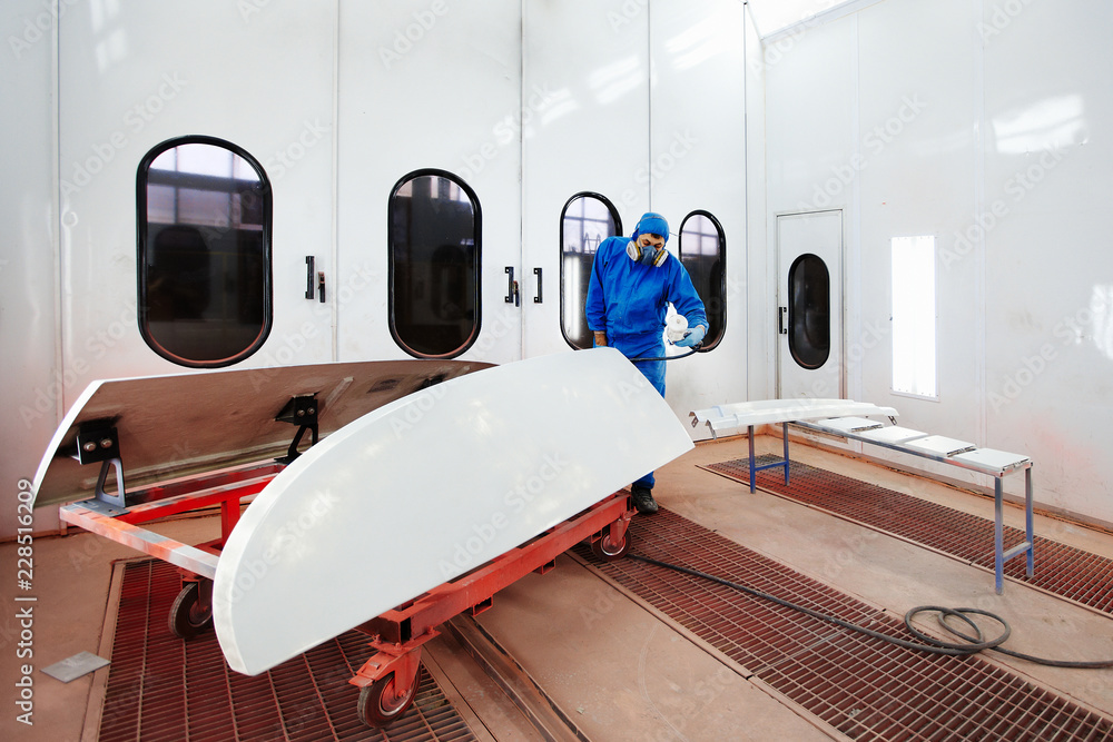 Paint and varnish camera. The worker paints a detail. Production of fiberglass details of the boat and car