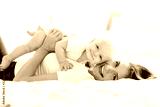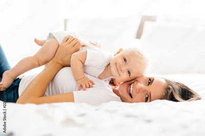 mother with baby on bed having good time