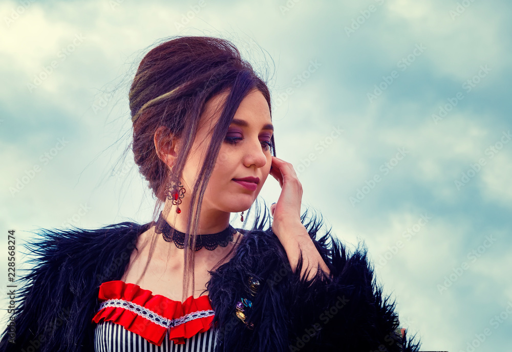 Beautiful sexy brunette girl dressed in cowboy style of wild west posing outdoors