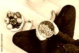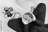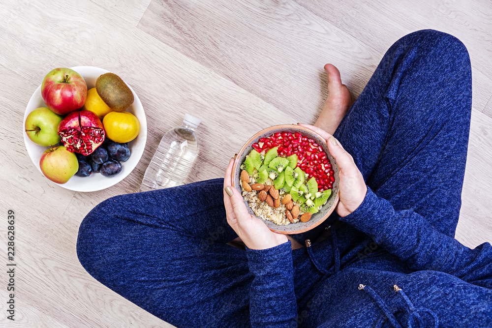 Fitness and healthy lifestyle concept. Female is resting and eating a healthy oatmeal after a workout. Top view.