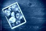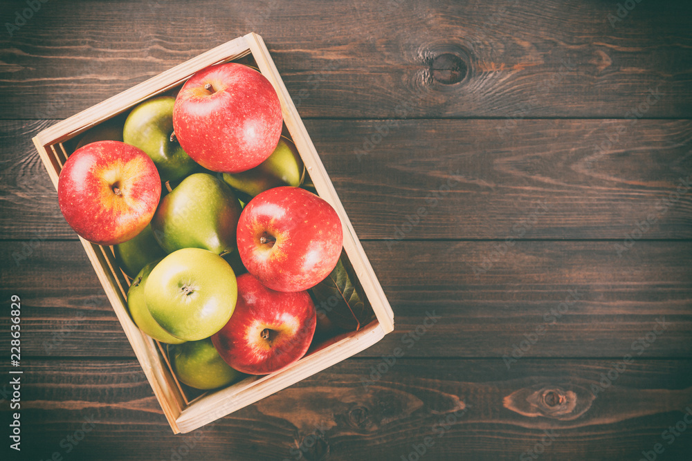 Ripe green and red apples in a wooden box on dark brown wooden rustic background. Autumn seasonal image with top view.