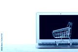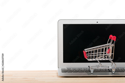 Red shopping cart on a laptop isolated on white background. Online internet shopping concept. Free space for your text