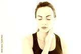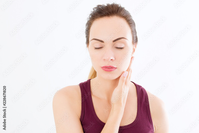 Macro Woman face with no wrinkles on forehead. Girl touching neck pain. Skin care and spa face beauty. Cosmetology facial treatment and anti aging concept. Copy space