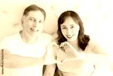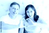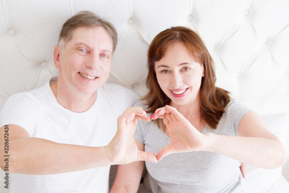 Smiling middle age couple showing heart sign by arms in bedroom. Love and family life relationship concept. Selective focus