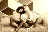 Beautiful african american girl with dark curly hair leaning head on pretty girl with blond hair dreamily looking in camera while holding hands each other with colorful wall on background