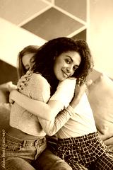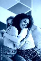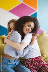 Young smiling african american woman with dark curly hair hugging girlfriend while dreamily looking in camera with colorful wall on background
