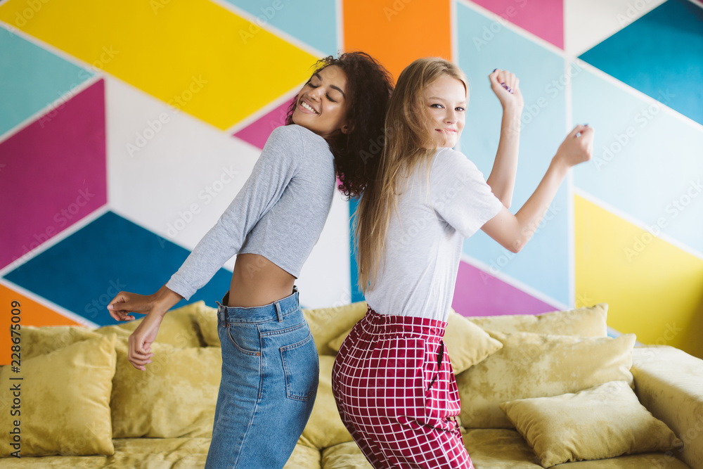 Attractive woman with blond hair and pretty african american woman joyfully dancing while spending time together with colorful wall on background