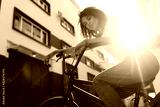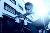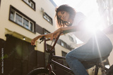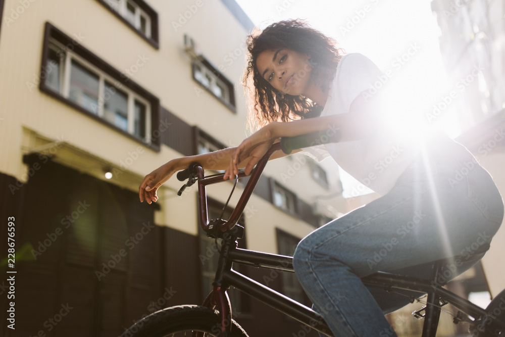 Young beautiful african american woman with dark curly hair in white T-shirt and jeans dreamily looking in camera while riding bicycle outdoor