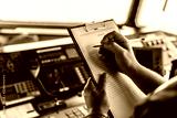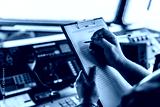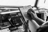 Marine navigational officer or chief mate on navigation watch on ship or vessel. He fills up checklist. Ship routine paperwork