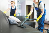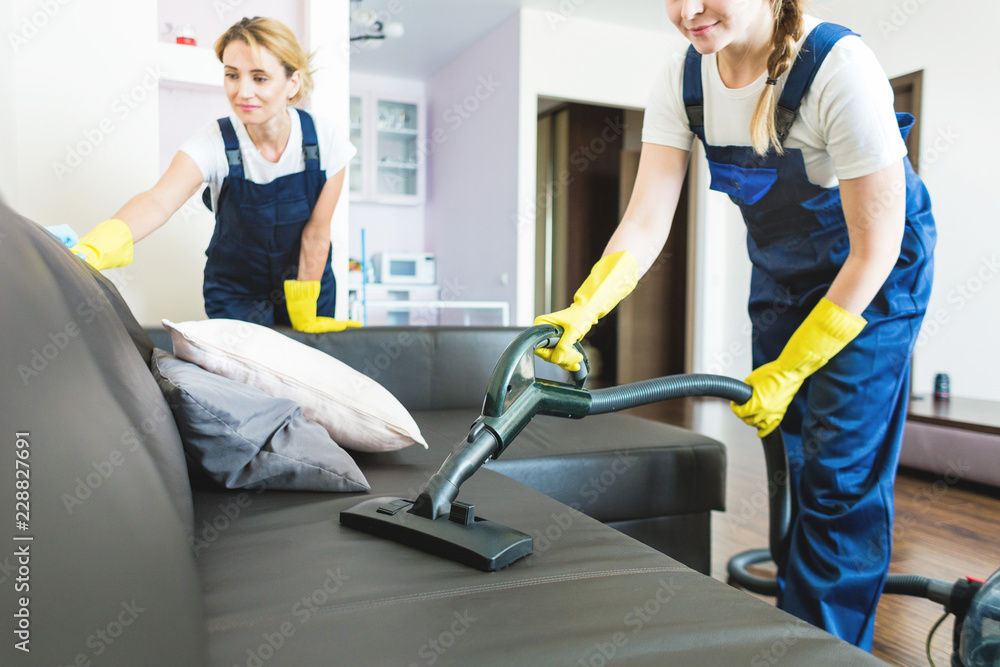 Cleaning service with professional equipment during work. professional kitchenette cleaning, sofa dry cleaning, window and floor washing. man and women in uniform, overalls and rubber gloves