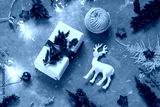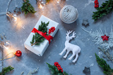 Christmas, New Year greeting card on the concrete texture background. Winter holiday concept flat lay. Copy space