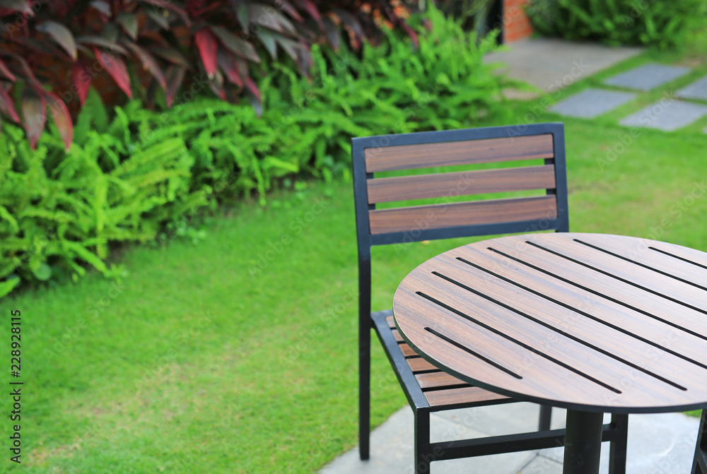 Circle wood table with chair in the green garden.
