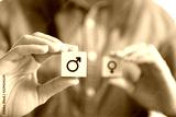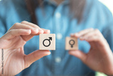 Hands holding male and blurred female icon