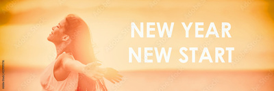 NEW YEAR NEW START motivational message, inspirational quotes for the New Year 2019 resolution in fitness weight loss. Happy woman with arms up for new life challenge banner panorama.